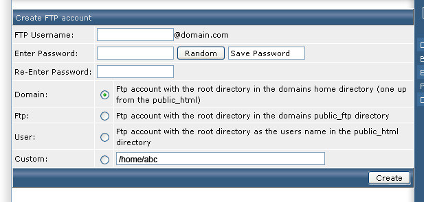 Remarks: If your domain is "abc.com" while your DirectAdmin username and new FTP account username are "abc" and "testing" respectively, selecting different options means the new FTP account mapping to different directories: