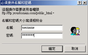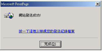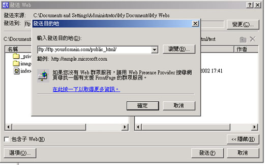 在 Frontpage的選單中按 "檔案" ,再按"發送 Web",在發送的目的地填入FTP 伺服器的 "ftp://ftp.yourdomain.com/public_html/" ,再按確定。