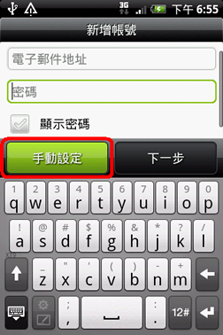 3. 输入电子邮件完整地址及户口密码,并选<<手动设定>>。