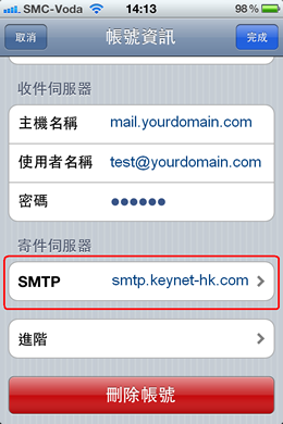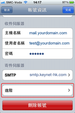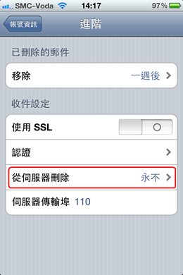 11. 收件设定方面,IPhone在下载邮件的时候,并不会从Webmail删除邮件,如需更改有关设定,可到<<从服务器删除>>一栏修改。