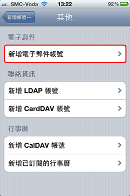 2. 选择<<电子邮件/联络信息/行事历>>,再选择<<新增账号>>。