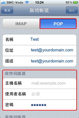5. 电子邮件类型选择<<POP>>,收件服务器设定如下: