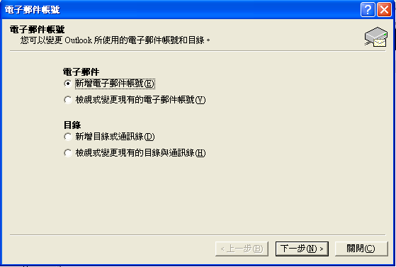 3. 在"电子邮件账号"选择"新增电子邮件账号",再按下"下一步"