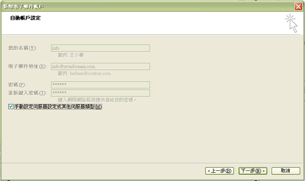 5. 输入以下资料后,点选"手动设定服务器设定或其他服务器类型"。