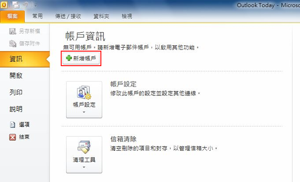 2. 按下主选单上的"档案" -> "信息", 选择 "新增账户"。