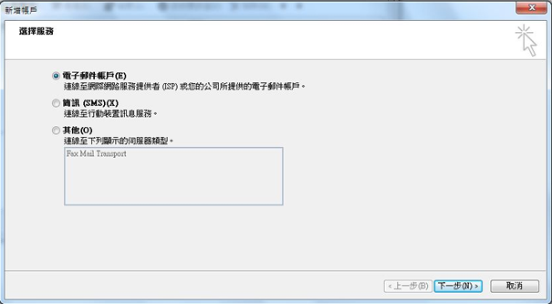 4. 选取"新增" ,点选"电子邮件帐户",再按下"下一步"。
