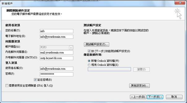9. 如你的网络供货商提供的SMTP需要验证或已申请我们SMTP服务的客户需按下 "其他设定" -> "外寄服务器"