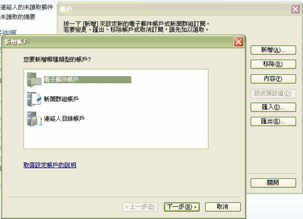 3. 在"帐户"按下"新增" -> "电子邮件帐户",按"下一步"。