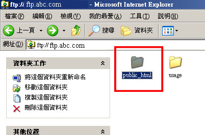 1. 登入後,你可以像使用檔案總管一樣,從您的電腦的資料夾複製到伺服器上,但注意,所有網頁檔案必須上載到資料夾(folder) "public_html" 內才可被瀏覽。如上載了 "abc.html"到資料夾(folder) "public_html" 內,你瀏覽的網址是