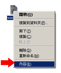 用滑鼠右鍵按著檔案 , 再按<內容> 來更改檔案屬性 :