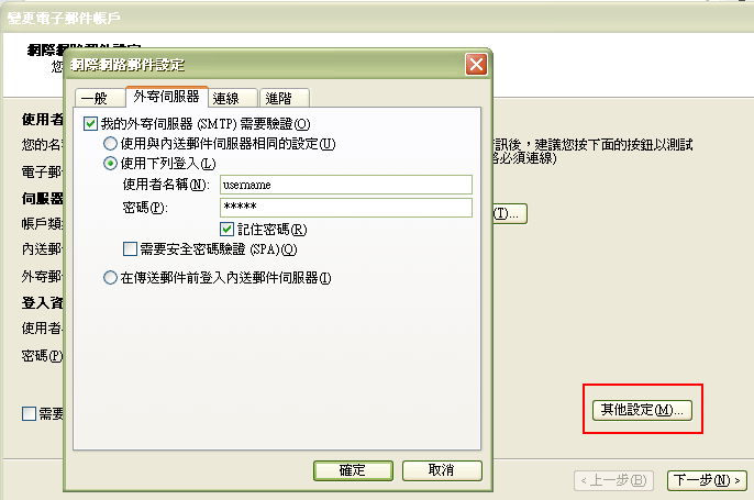 9. 如你的網絡供應商提供的SMTP需要驗證或已申請我們SMTP服務的客戶需按下 "其他設定" -> "外寄伺服器" 剔選"我的外寄伺服器需要驗證",並輸入網絡供應商提供的用戶名稱及密碼