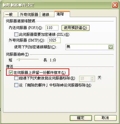 10. 如需要在Webmail及Outlook內收取相同的郵件,可在"進階"一欄剔選"在伺服器上保留一份郵件複本"。