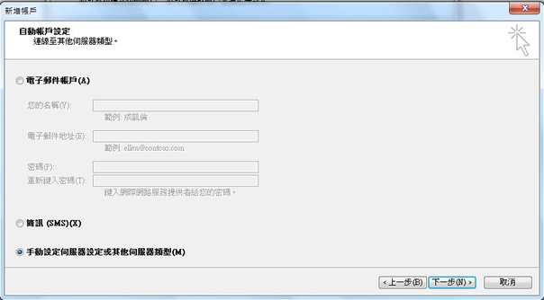 5. 點選"手動設定伺服器設定或其他伺服器類型",再按下"下一步"。