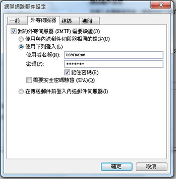 剔選"我的外寄伺服器需要驗證",並輸入網絡供應商提供的用戶名稱及密碼