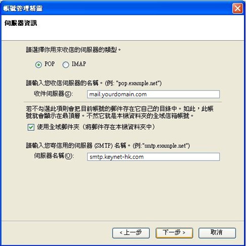 5. 選擇"POP"伺服器 收件伺服器: mail.你的域名.com 寄件伺服器: (客戶可使用你的網絡供應商(ISP)提供的SMTP) 如已申請我們的SMTP/ SMTP1025 服務,請輸入我們提供的 SMTP 伺服器名稱