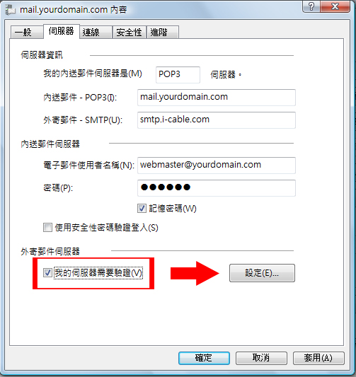 您的ISP提供的SMTP伺服器名稱,如使用 商業網上行 的便輸入"corpmail1.netvigator.com"