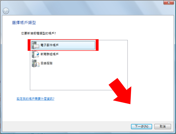 4. 選擇<<電子郵件帳戶>>,再按<<下一步>>。