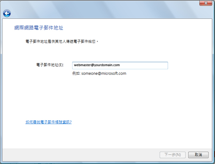 8. 請注意,如電郵地址是webmaster@你的域名.com ,帳戶名稱便是webmaster@你的域名.com。輸入密碼後,按<<下一步>>。